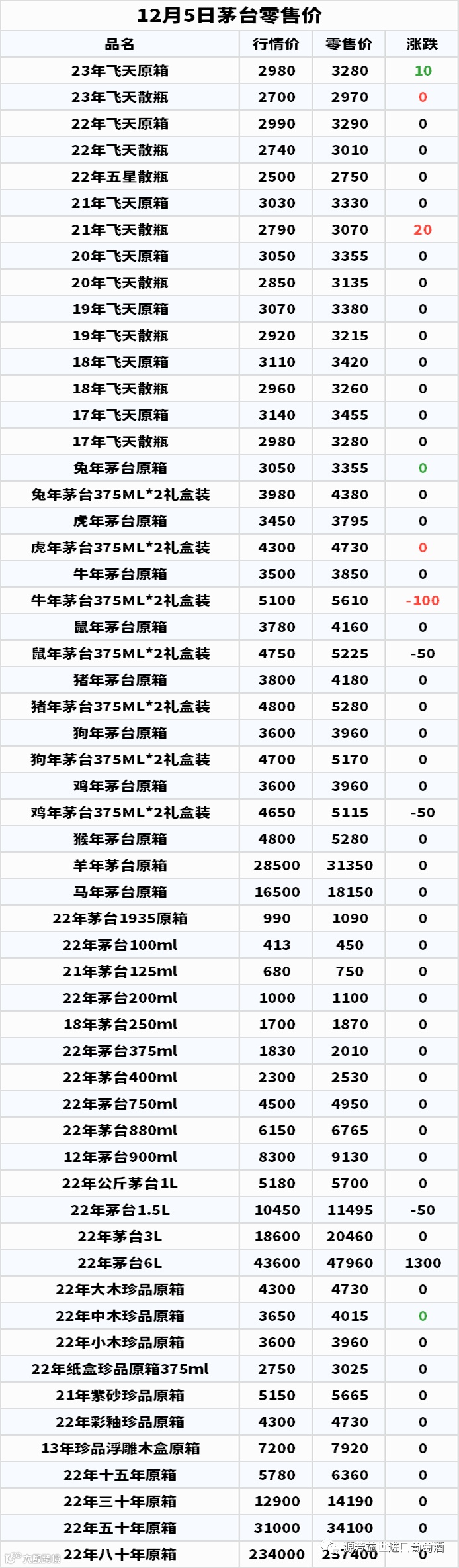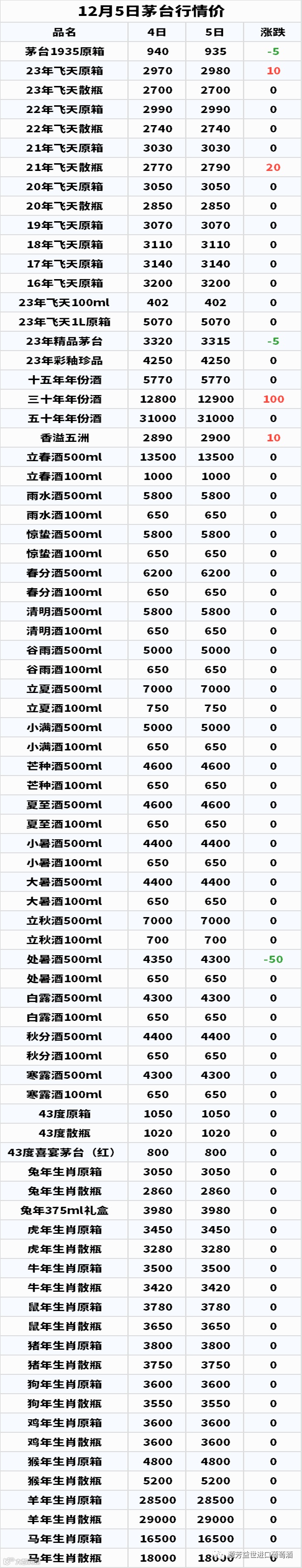 今日(12月5日),依照网络发布的白酒价格行情监测数据,整理成下表给大家参考。