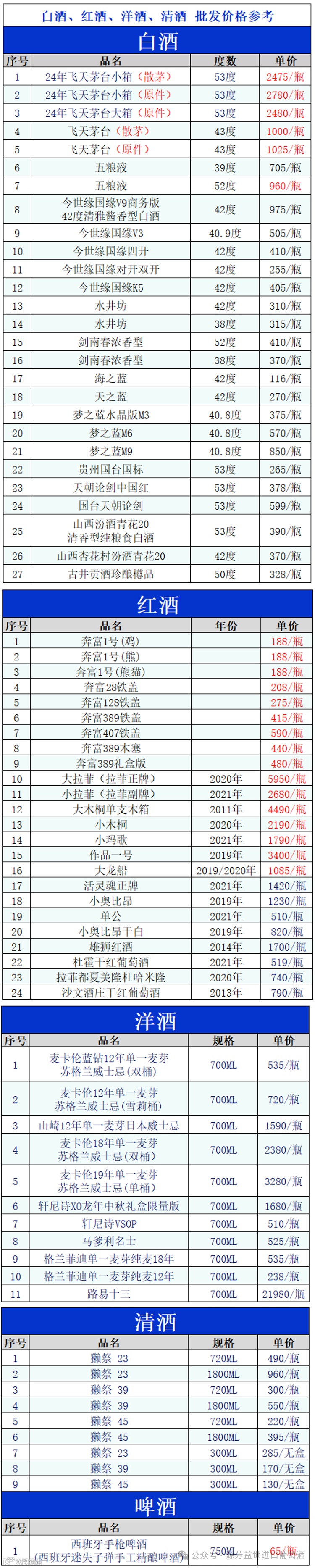 今日(8月19日),依照网络及市场调研的价格行情监测数据,整理酒类行货价格成下表给大家参考。