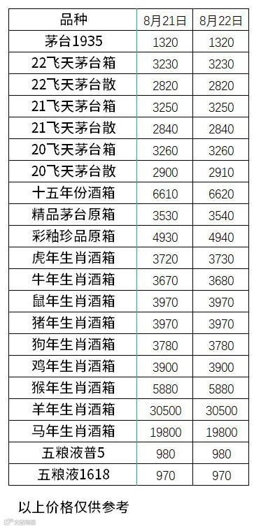 今日(8月22日),从网络发布的白酒价格行情监测数据显示,今天茅台酒的售价又有了一定的上涨。