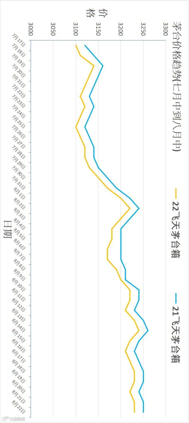 下面的图表中,可以明显的看出飞天茅台原箱的价格,在七月到八月的这一个多月的时间内,市场价格正在逐渐走高,小编猜测这趋势可能还会继续上升,因此还请要入手的亲们,可以先行入手备货噢。