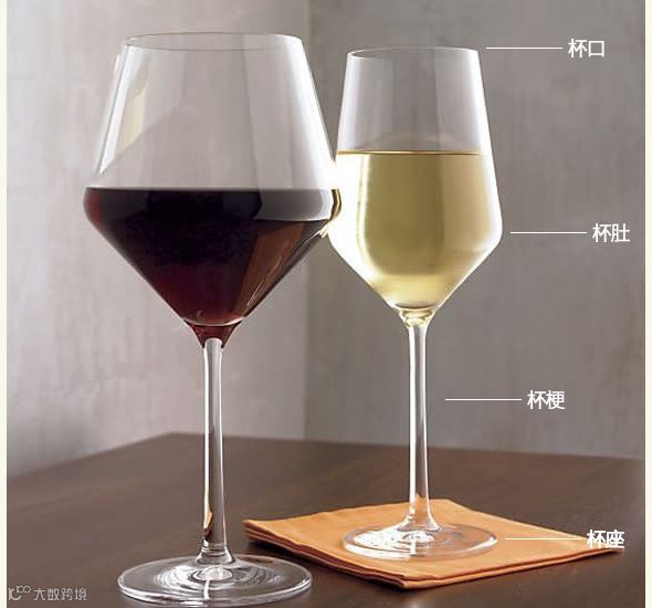 杯肚:白葡萄酒杯的杯肚比红葡萄酒杯的小。白葡萄酒杯的杯肚外观也不会那么弯曲,杯口也会窄得多。