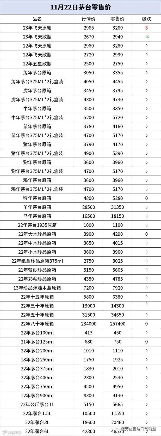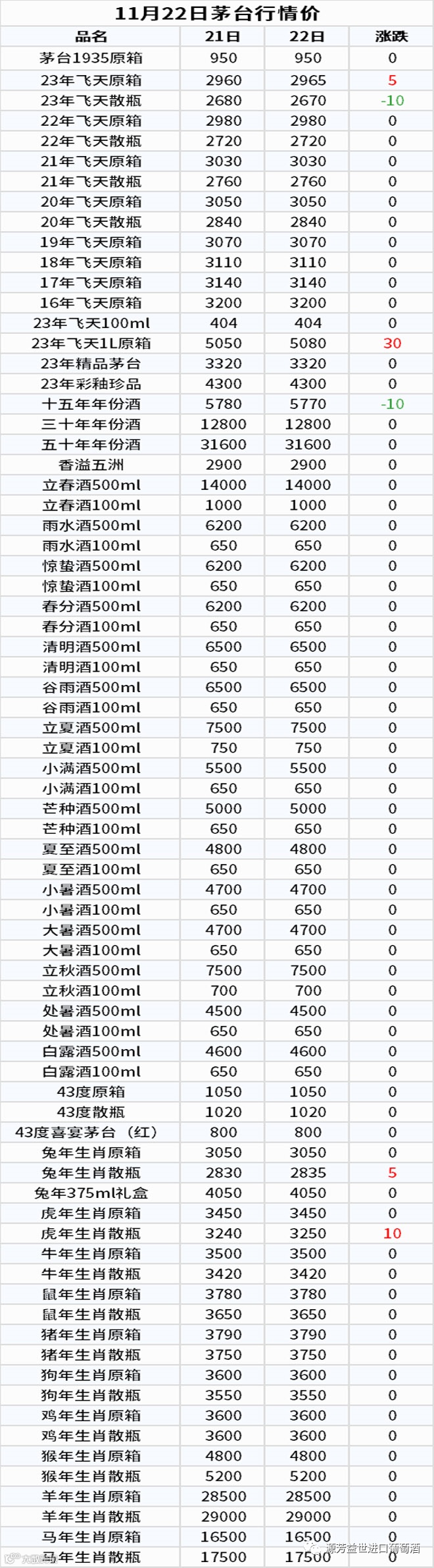 今日(11月22日),依照网络发布的白酒价格行情监测数据,整理成下表给大家参考。