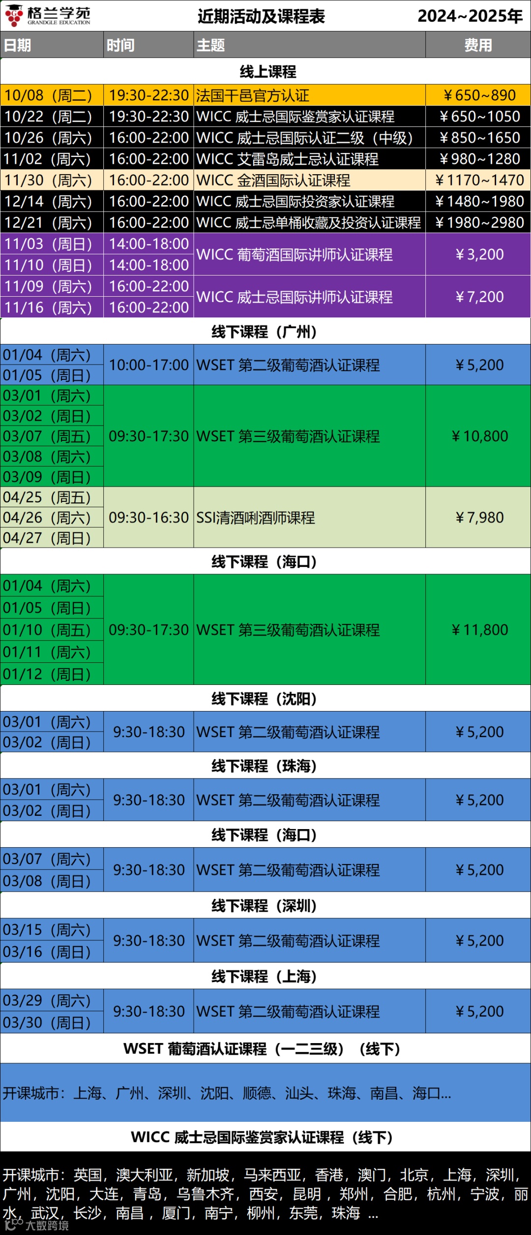 开课城市及时间如下