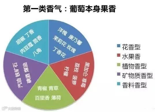 一类香气一般来自葡萄本身,主要包括果香、草本或花香味,具体如下: