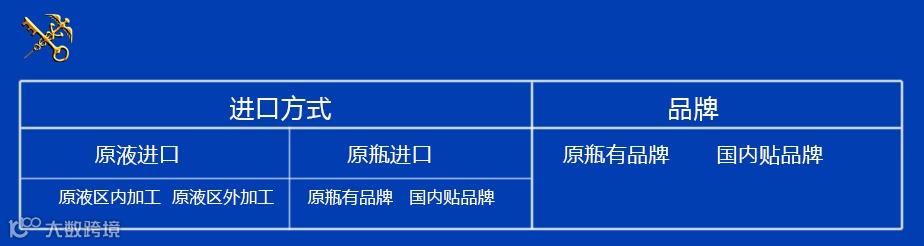 进口方式申报,区分出散酒进口(原液区内加工、原液区外加工)还是原瓶进口(原瓶有品牌、国内贴品牌)。