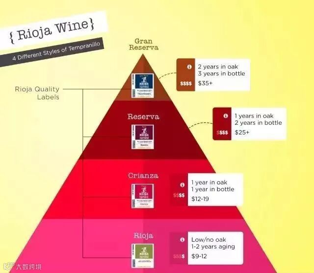 看葡萄酒产地:一瓶西班牙葡萄酒来自里奥哈,那这瓶酒一般不会差,因为里奥哈是西班牙最重要的 DOC 认证产地,风土非常好,非常适合葡萄的种植和生长。