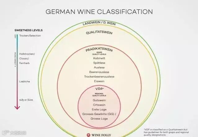 而优质高级葡萄酒又分为 6 大类,从低到高主要依次为:珍藏酒(Kabinett)、晚摘酒(Spatlese)、精选酒(Auslese)、逐粒精选酒(Beerenauslese)、逐粒枯萄精选酒(Trockenbeerenauslese)和冰酒(Eiswein)。一般在精选酒级别以上的葡萄酒,品质均较高。