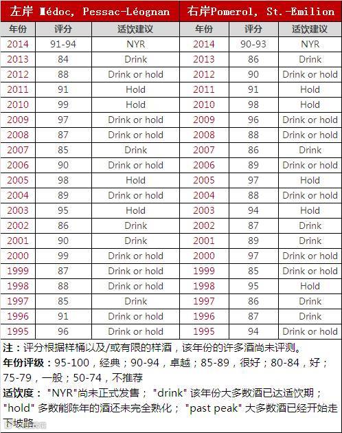 右岸:口感较甜美、柔順、享乐主义风格。右岸的葡萄酒主要是用梅洛酿制而成,因此单宁含量适中偏高,结构并没有左岸的那么强,口感柔顺,风味丰富,酒精度较高,带有复杂的红梅和李子的香气。