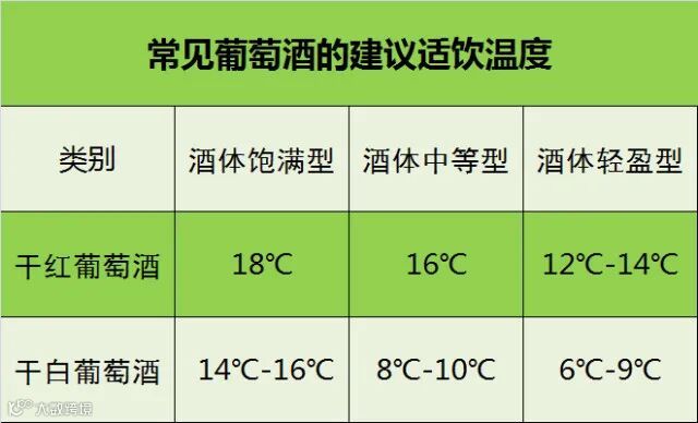 轻盈型:这类葡萄酒的酸度一般较高,温度过高会凸显酸度,影响口感,所以建议适饮温度为 6℃-9℃。