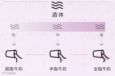 我们可以把不同葡萄酒的酒体与其它饮料带来的口感进行比对。例如,大体上,酒体饱满型葡萄酒就像牛奶在舌头上的质感,酒体轻盈型葡萄酒就像纯净水的质感,而酒体中等型则介于这两者之间。