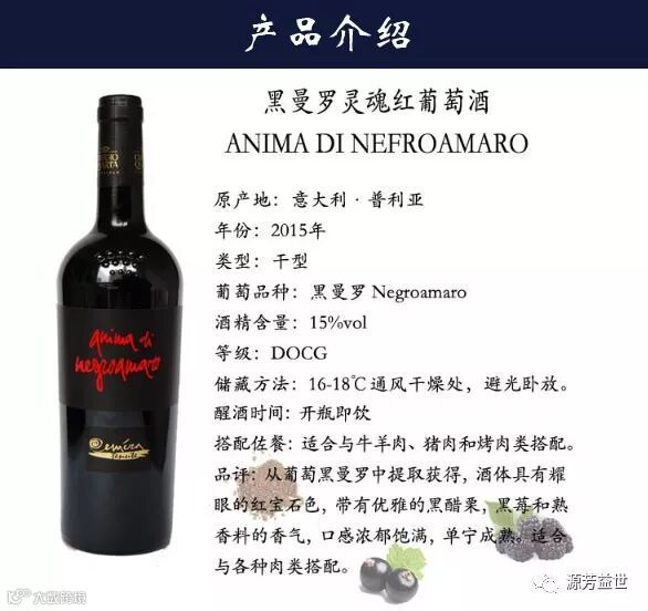 意大利葡萄酒是世界上最难懂的葡萄酒之一,这不仅由于其复杂的等级划分系统,还在于意大利拥有众多的葡萄酒品种。事实上,目前得到意大利官方认证的葡萄酒品种就到达350种左右,而据不完全统计,整个意大利种植着超过2000种的酿酒葡萄,而且,有些葡萄还只有意大利才有的本土品种,这款黑曼罗灵魂红葡萄酒就是意大利很具有代表性的一款酒。