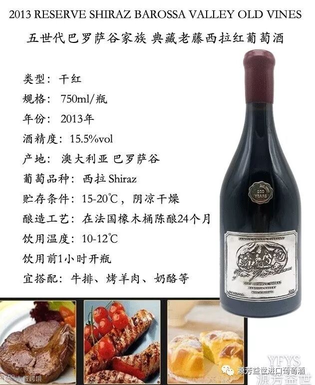 五世代巴罗萨谷家族典藏老藤西拉红葡萄酒,该款葡萄酒拥有不可思议的深色浆果口感,尤其以罕见的桂圆及咖啡味突出,同时伴有原野的草本植物味道,以甘草味突出。酒体均匀,气味醇厚,口感顺滑、柔和,舒适度酸度,品尝起来柔软如丝绸一般顺滑。单宁雅致复杂,回味悠长,难以忘却。