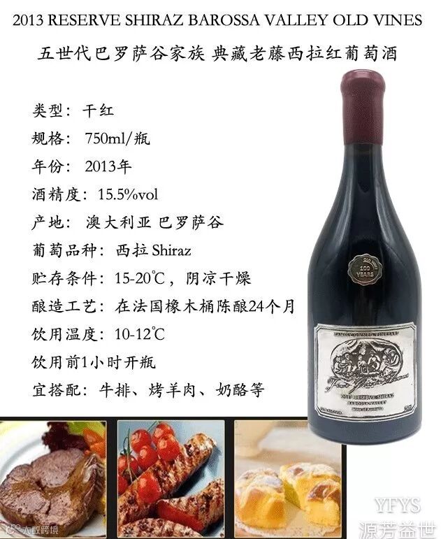 五世代巴罗萨谷家族典藏老藤西拉红葡萄酒采用澳洲著名产区巴罗萨谷葡萄酿制,陈酿于清香的法国橡木桶内24月之久,酒体颜色致密,呈深石榴色和暗紫色,边缘色彩富有活力。带有黑莓、黑胡椒和黑醋栗以及香草的香味,仿佛有种野生草本植物的气息。