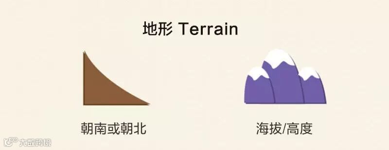 葡萄园的朝向、海拔和高度都会影响葡萄的生长,这些都会反映在最终的葡萄酒风格上,自然就影响了葡萄的品质。除了海拔之外,影响葡萄园质量的因素还包括地理特征,如山脉、河谷、内陆等等,还包括其他植物如树木花草以及大型水系的影响。