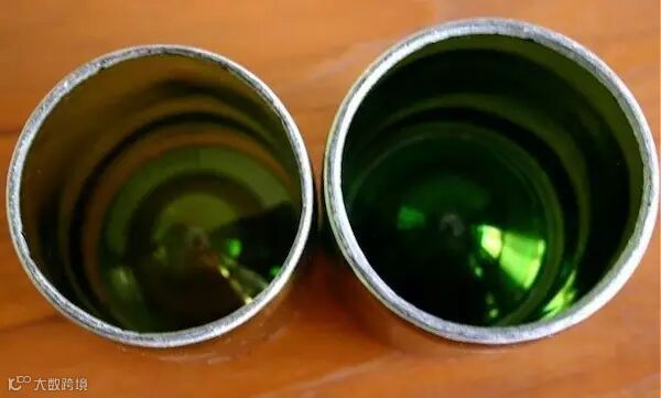 右边酒瓶的玻璃厚度明显与左边大不一样