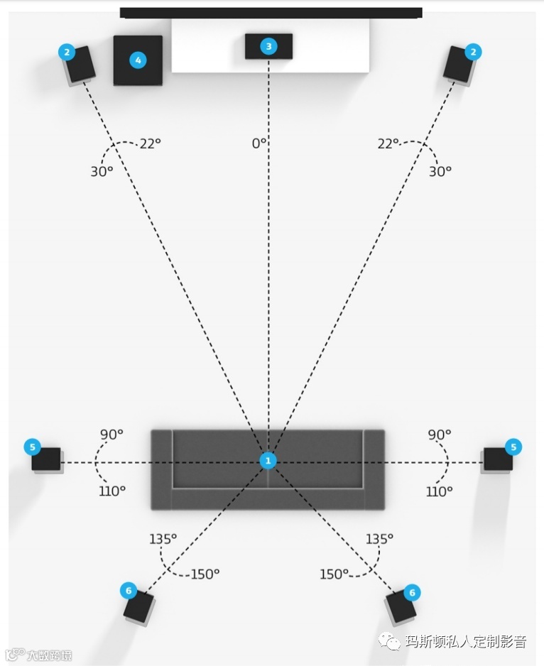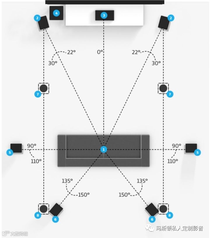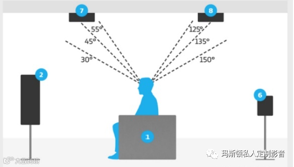 7.1.4声道一般称为全景声,在7.1声道的基础上加了4个天空声道,颇受影音发烧友的喜爱,全景声不仅仅是增加几个声道那么简单,而是把整个声音架构都颠覆了,从之前基于声道来混音的技术上升为基于对象的音频处理技术,根据具体环境,通过解码器计算之后按照算法来指定具体的某些喇叭输出,给听众更自然与真实的声场,将生活元素鲜活地融入故事场景中,具体摆位参照下图