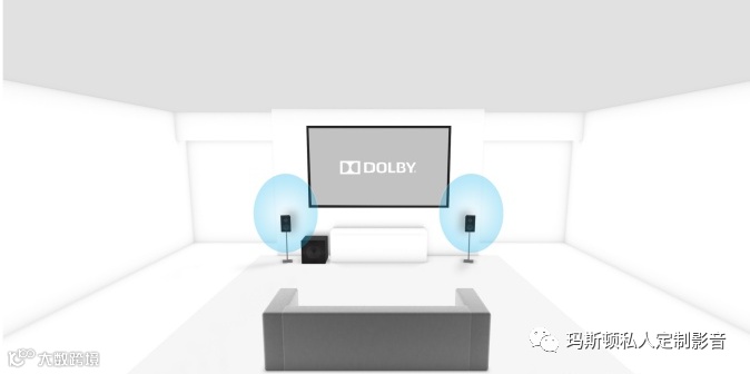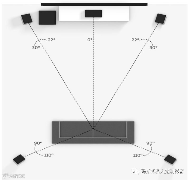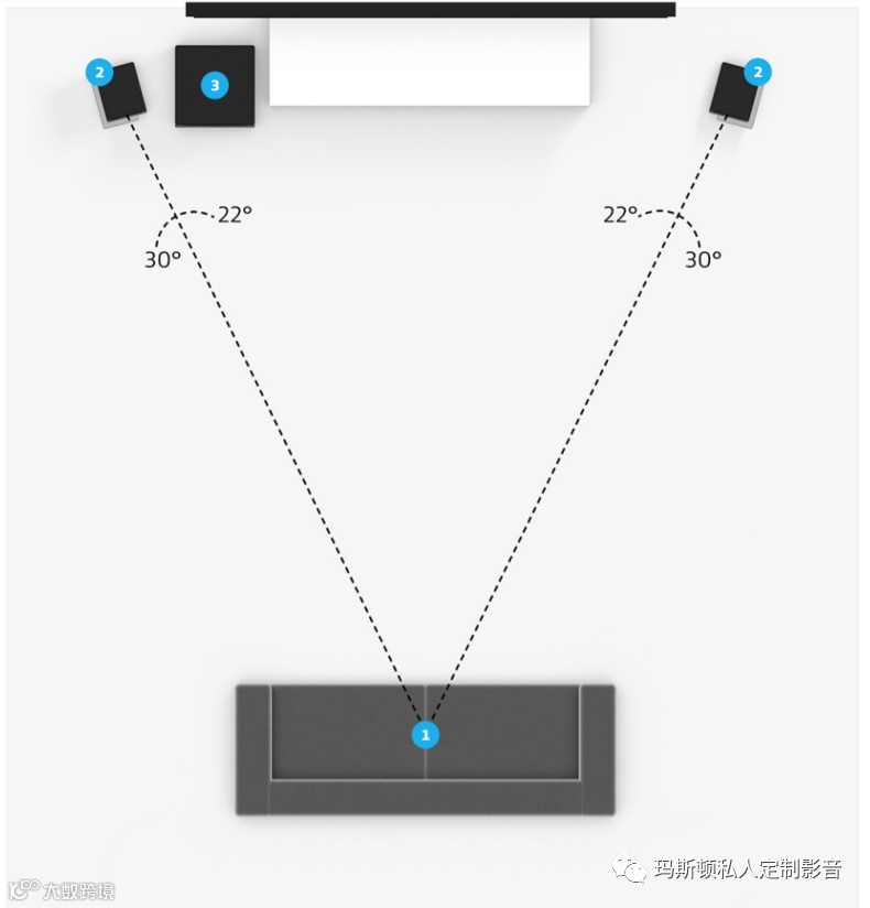 2.1声道由左右双声道的立体声,由两个音箱和一个低音炮组成,是比较入门的家庭影院配置,具体摆位可以参照下图