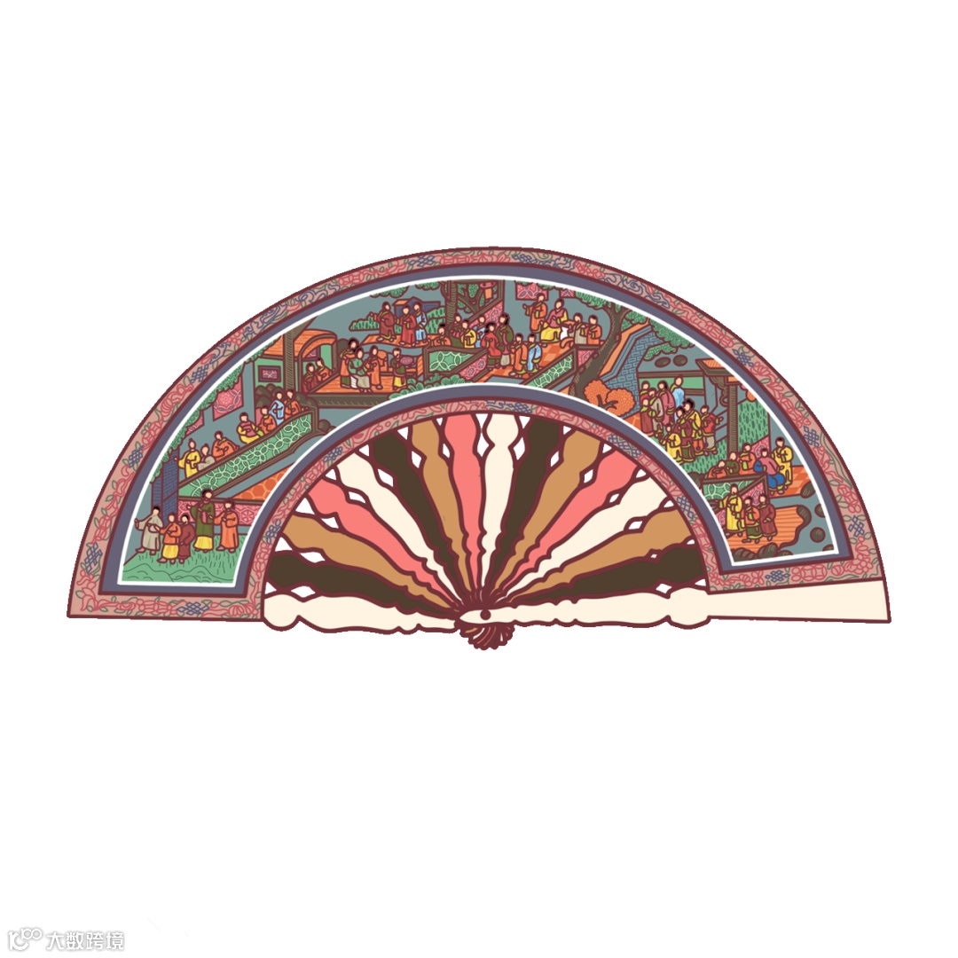 女子在圆形的背景中手持一幅方形的玻璃画。明末清初玻璃画在广州兴起,成为广东重要的工艺品类,也是中国外销画的重要组成部分。