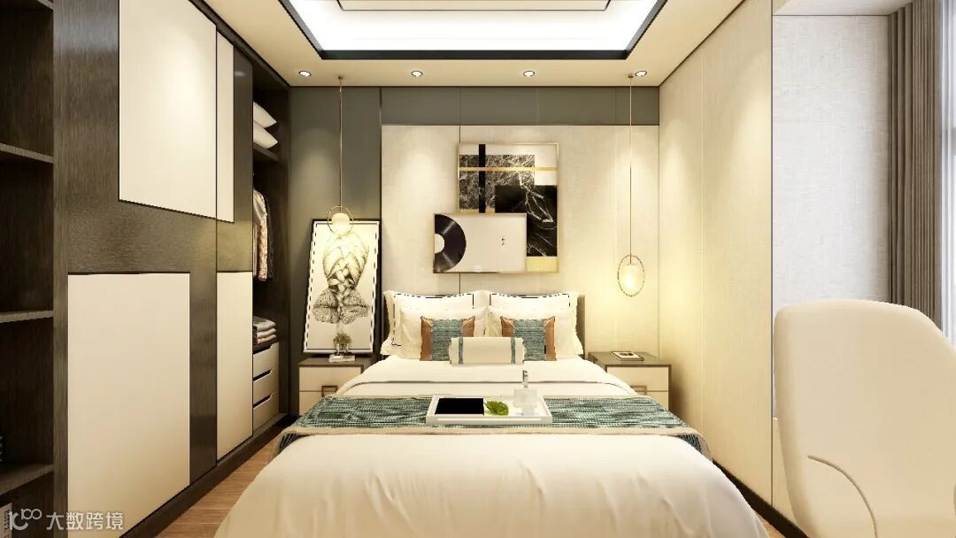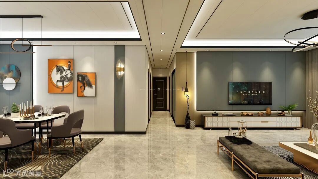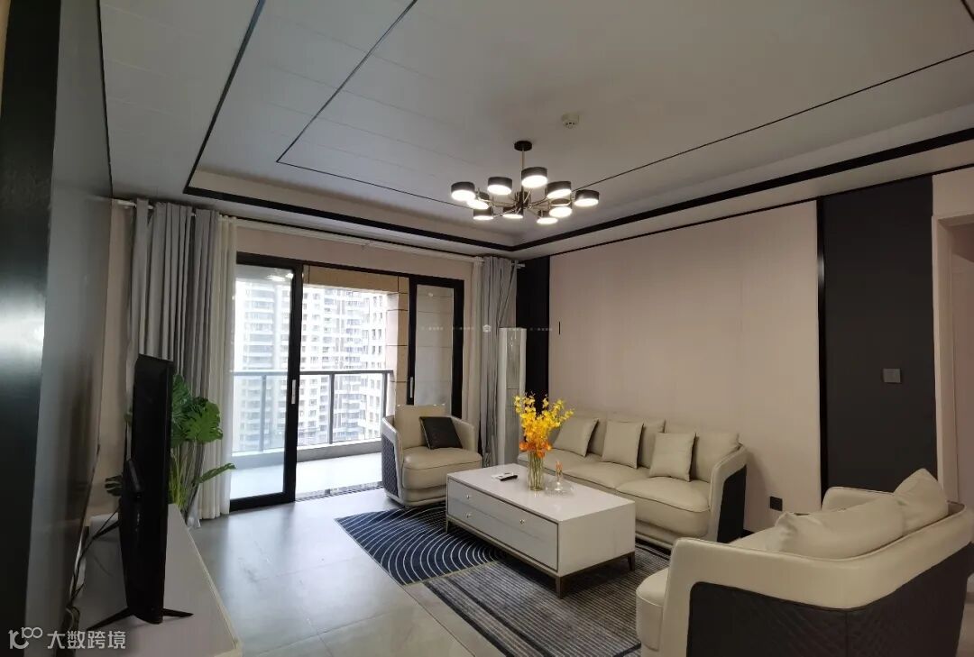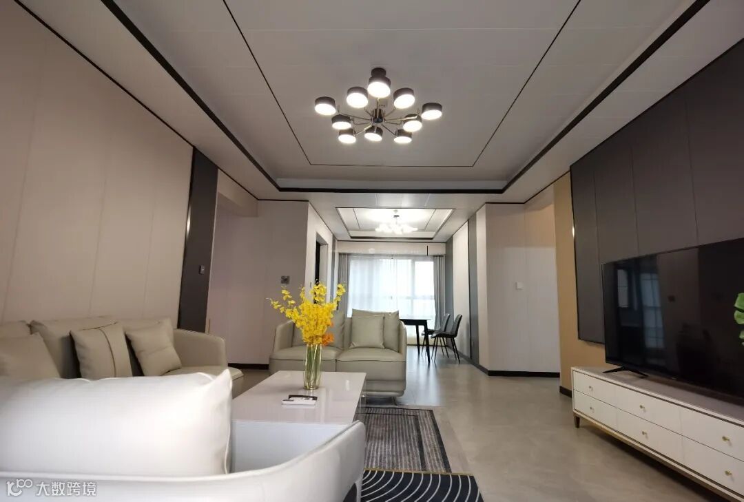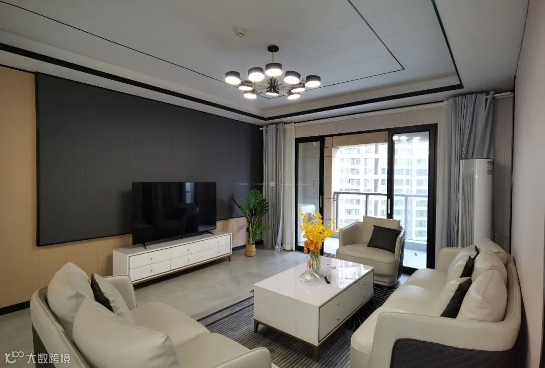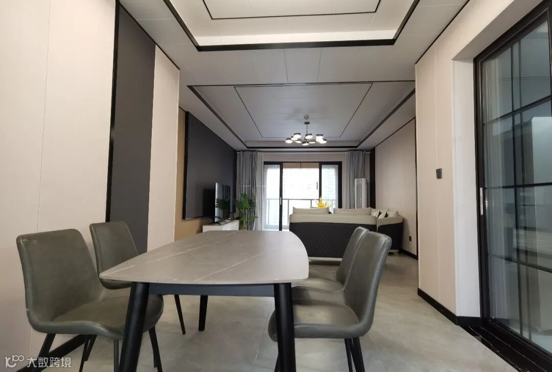 牛牛公寓是现代极简的风格,全屋墙面选用了竹木纤维集成墙板,全屋平铺,加上灰色墙板色调,看上去比较沉稳大气,天花吊顶也是选用了400的墙面。做了二级吊顶,白色墙板搭配黑色金属线条,简约而不简单。