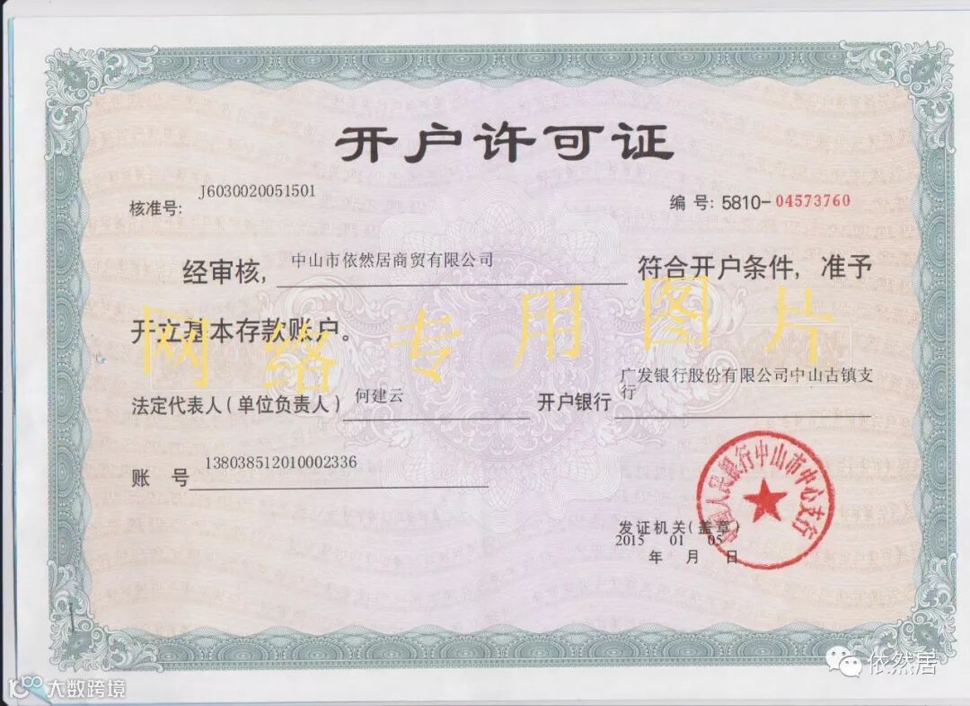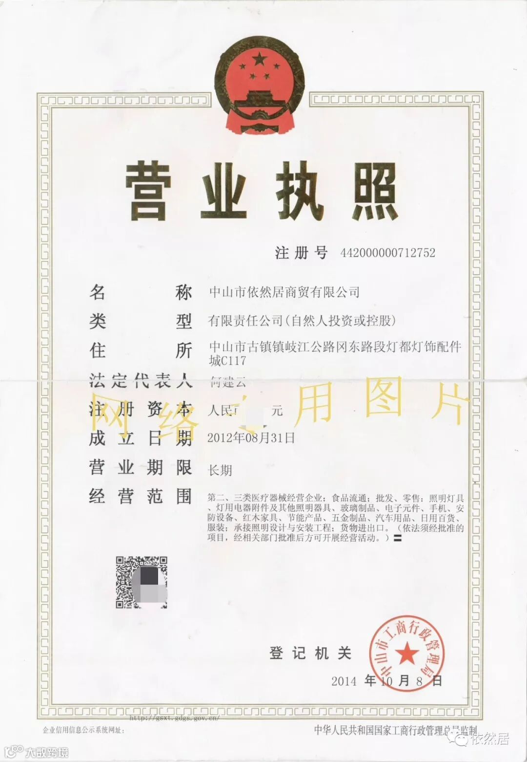 导读:中山市依然居商贸有限公司证件档案;企业法人:何建云;联系电话:189 3334 7776(微信同号)