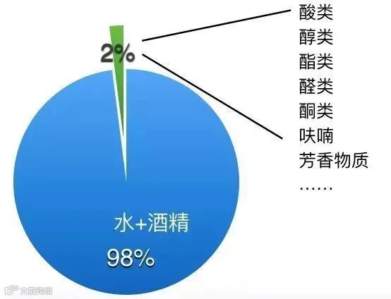 酒中98%以上是水和酒精,不同酒的味道差异来自于2%的其他成分,比如醛类、酯类和芳香族类。