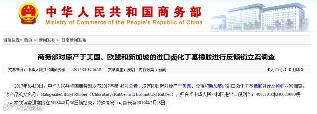 • 商务部30日决定,即日起对原产于美国、欧盟和新加坡的进口卤化丁基橡胶进行反倾销立案调查。