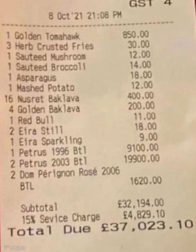 因为这顿饭竟然要37023英镑,合计人民币32万多。