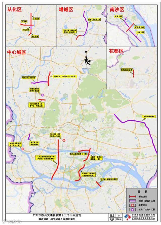 “十三五”期间,广州主要完善和改进从化区、增城区、南沙区、花都区以及中心城区的城市道路交通网络,从而更加流畅地处理广州的交通堵塞问题。