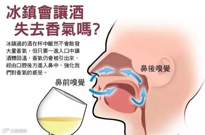 冰镇过的葡萄酒在杯中虽然不会散发大量香气,但只要一进入口中,让酒体回温,香气仍会被引出来,经由口腔后方进入鼻中,强化我们对香气的感受。下次品尝冰镇酒时,可以让酒在口中多停留一会,借由口中的温度提升葡萄酒迷人的香气,让自己有更全面的享受。