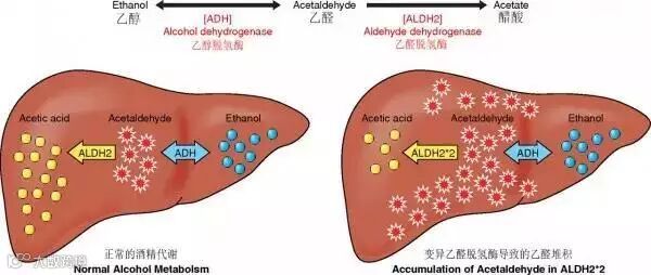 然而,有的人体内天性缺乏乙醛脱氢酶(或者是不足),这使得喝酒时体内会迅速累计乙醛,迟迟无法代谢。这些乙醛会使体内毛细血管迅速扩张,进而出现脸红的反应。