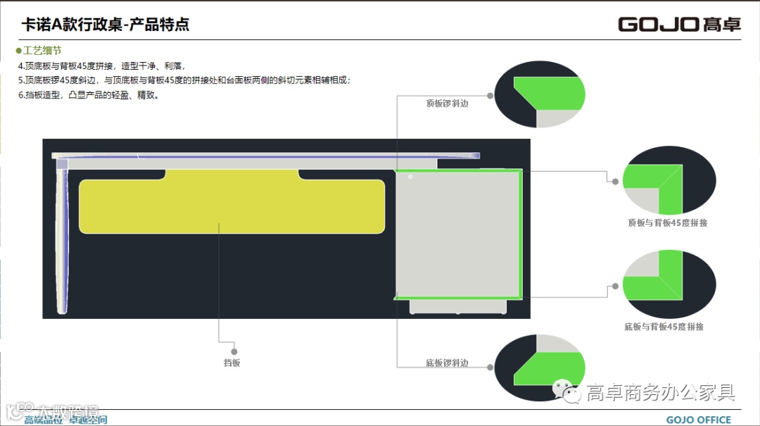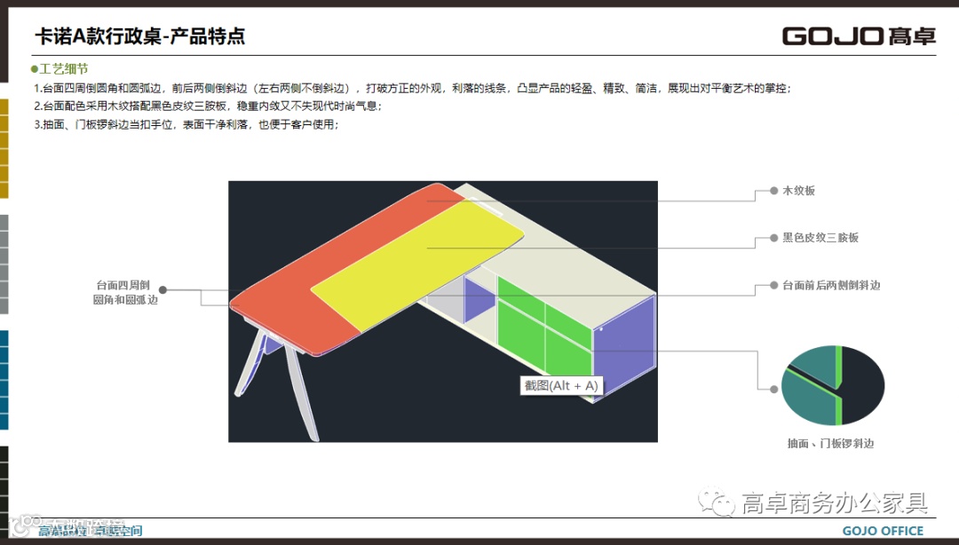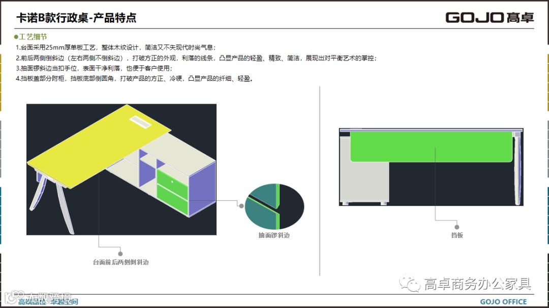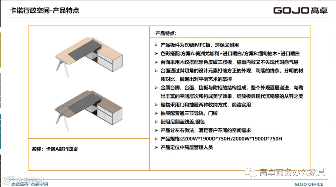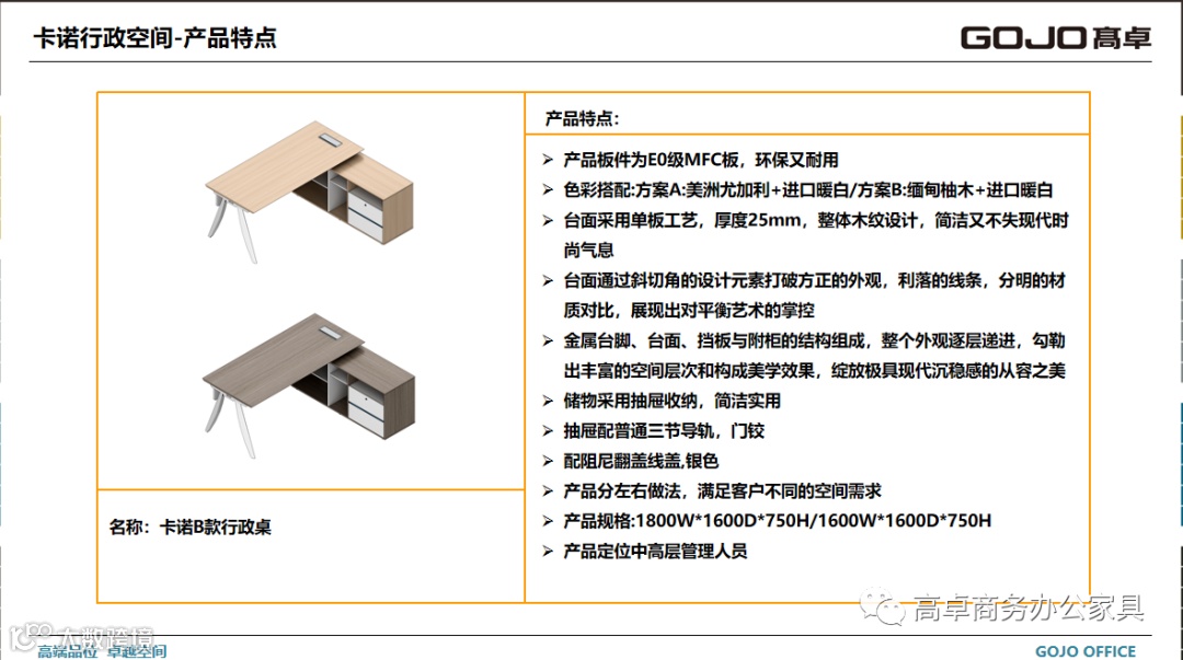 导读:卡诺系列是高卓板式类产品中的中高端产品。在设计构思上追求大气而不霸气,追求品味而不是奢侈。将不同质感机理的材质,相互之间巧妙融合,营造丰富、和谐、统一的设计风格。宽大的金属台脚,独一无二的流畅线条,力