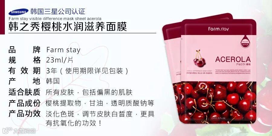 含有樱桃提取物,使发暗粗糙的肌肤变得清新光彩照人。环保质地面膜纸,紧紧贴合面部肌肤,使需要保湿的肌肤得到彻底的滋养护理。
