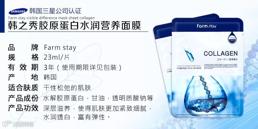 含有水溶性的胶原蛋白提取物,弹力滋养,管理角质。环保质地面膜纸,紧紧贴合面部肌肤,使需要保湿的肌肤得到彻底的滋养护理。每片胶原蛋白面膜都富含分子量为280D的胶原蛋白肽,胶原蛋白肽是经酶分解的海洋胶原蛋白肽精华,这种肽比细胞膜孔还要小,吸收率高达95%以上,所以胶原蛋白面膜能直达皮肤的真皮层,达到深度锁水和深层滋养的效果,使得肌肤紧致细腻、水润透白、富有弹性。