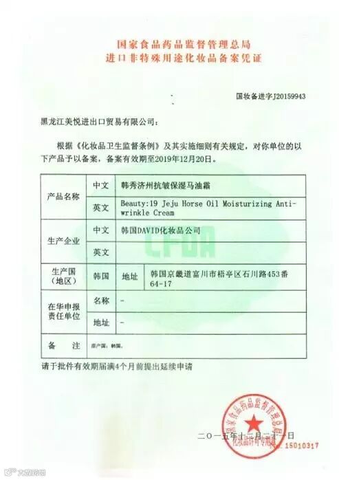 黑龙江美悦进出口贸易有限公司为韩国DAVID化妆品公司Beauty:19品牌系列护肤产品在中国的唯一战略合作伙伴和唯一合法代理商,Beauty:19品牌系列护肤产品已经取得中国国家食品药品监督管理局检验合格报告,全部经海关途径正规进口,报关手续完备,并且是韩国本土唯一由韩国最大规模保险公司,三星保险公司质量承保的马油产品。