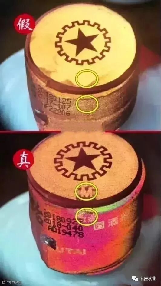 看红胶帽生产日期上方的黑斑块。只要仔细观察,你会发现红胶帽生产日期上方会有一个小黑斑块的,购买飞天请认准它,这不是包装脏了,而是一处暗记。