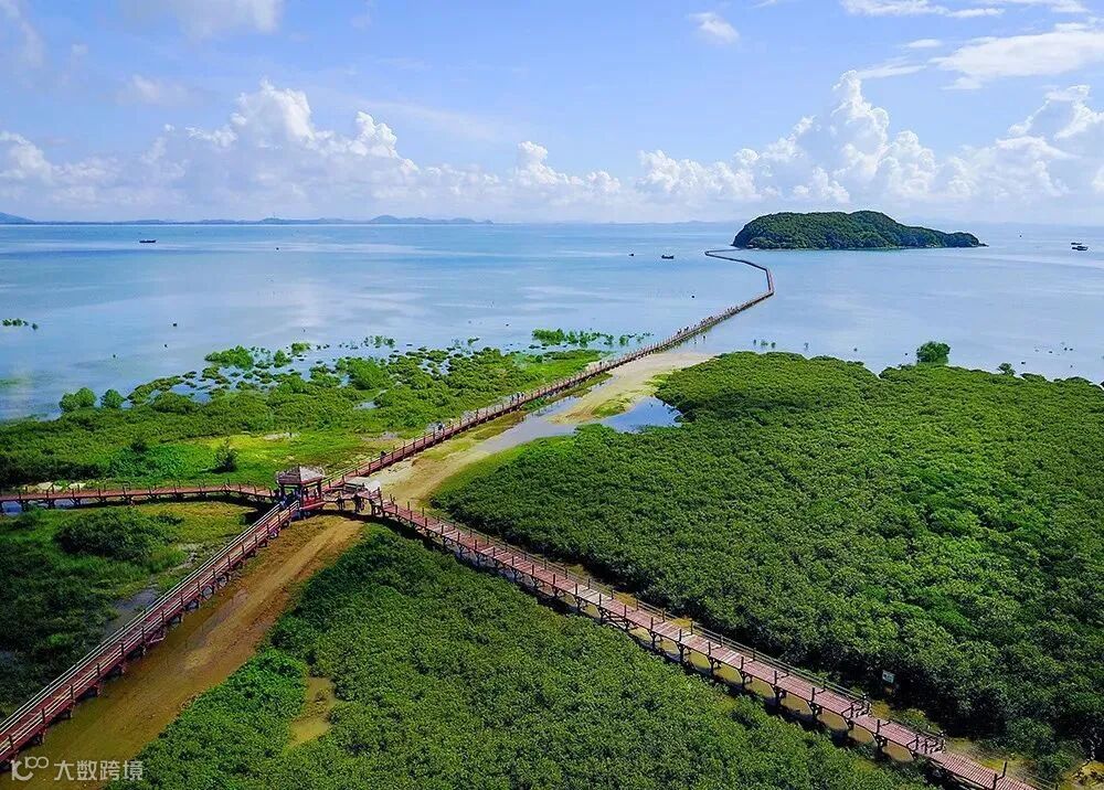 海陵岛红树林湿地公园是阳江首个红树林湿地公园,位于海陵岛东部神前湾,放眼望去,仿佛一座森林静卧于海边,青与蓝色交相辉映。近观则能欣赏到草长鹭飞的自然和谐之美。公园内有一条全省最长的跨海木栈道,向海而行,波澜不惊。