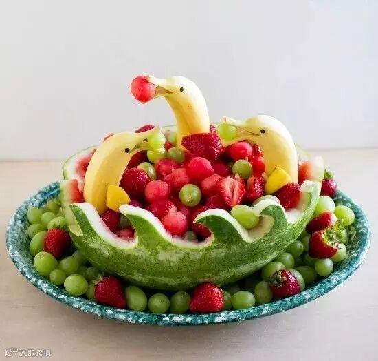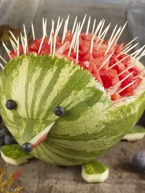 把西瓜整个掏空,留下西瓜皮雕刻成喜欢的样子,当天然的容器。将切好的西瓜和其他水果放进去,招待朋友绝对倍有面子。