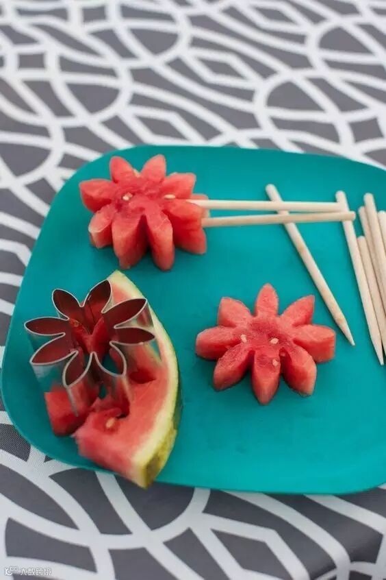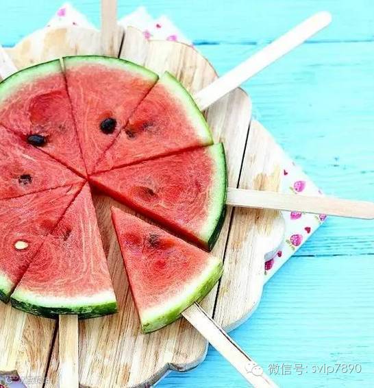 西瓜汁水多,一个弄不好四处溅,洒到衣服上还不好洗。将西瓜切成小块,用冰棍签串上,是不是方便很多。