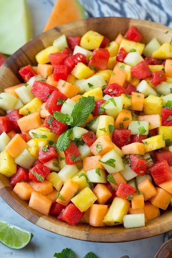 瘦身减肥少不了沙拉,生在夏天的西瓜更是夏日减肥良品。将西瓜、哈密瓜、菠萝切丁混合搅拌,淋上蜂蜜,饱腹零热量的夏日减肥良餐就做好啦。