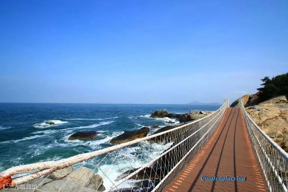 海边有一段长长的索桥~~岩石上被风雨侵蚀的桥身