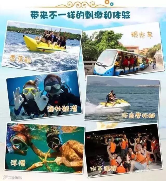 岛上有多种娱乐项目:有夜潜、海外船潜、浮潜、环岛摩托艇、香蕉船、水手课程(出海抓鱼)、休闲电动车、5D电影、自助海鲜烧烤+啤酒。