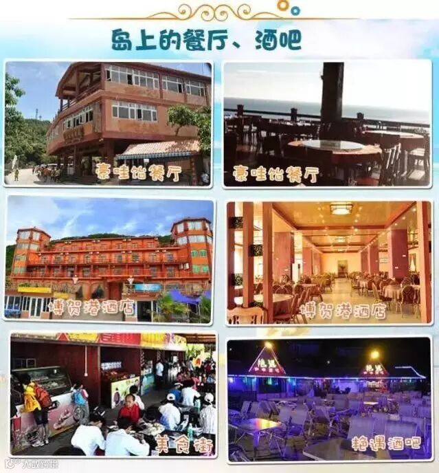 放鸡岛是一个开发成熟的旅游岛,岛上餐饮非常丰富。团体用餐和点菜可以选择在豪哇怡餐厅、博贺港酒店;也有风情美食街上的各类小点、粥粉面、烧烤、套餐等;还有艳遇酒吧吃海鲜烧烤喝啤酒、卡拉OK狂欢。