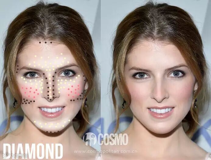 菱形脸的MM要注意其实比例比较完美,适合蘑菇型刷子,一般可在笑肌位置用刷子有外往内以打圆方式刷上腮红。