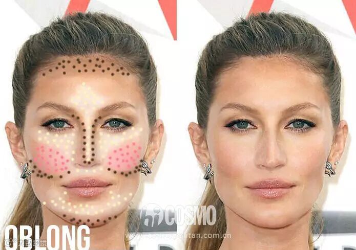 长形脸的脸部偏长,因此在画腮红的时候,可由直接用刷子少量腮红,从笑肌最高处横跨颧骨。在外眼眶的位置来回抹就可以了,不要太多手法要轻。