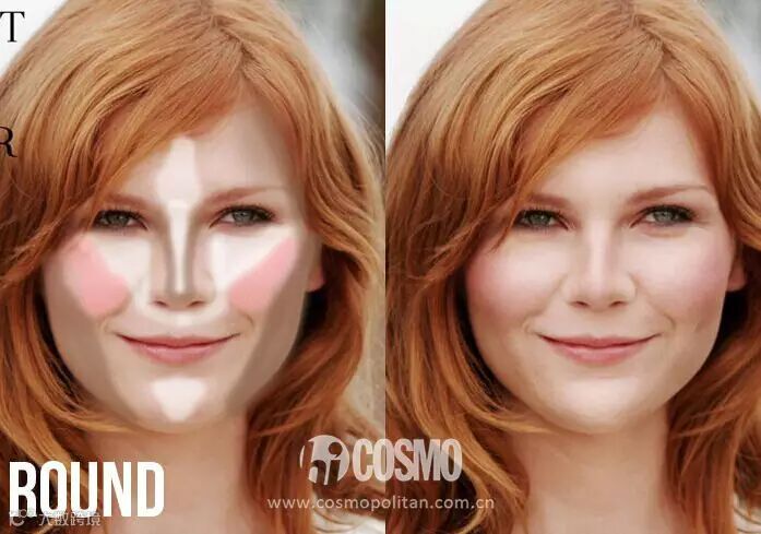 圆脸脸型比较圆润,所以打圈似的画法并不是太推荐。一般使用V型画法,可以将腮红由上往下尽量刷长,可以起到拉长脸型的效果。