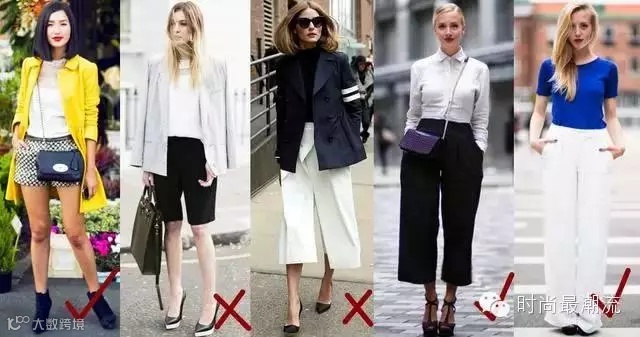 无论是直筒型还是紧身裤,长裤和九分裤都是小个子的首选,紧身裤最好是九分裤,或者是卷边成九分裤,阔腿裤选择长裤遮住鞋跟非常显气质显高度。七分裤和五分裤千万不要尝试,没有高个子的大长腿,你穿不出它的气场!