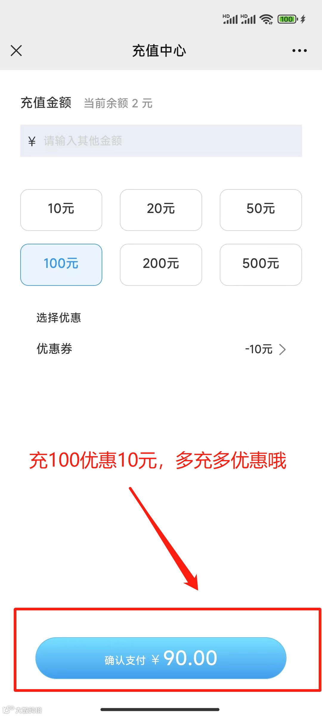 一次性充值满100元优惠10元