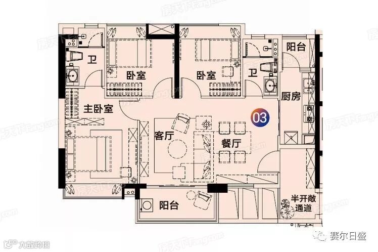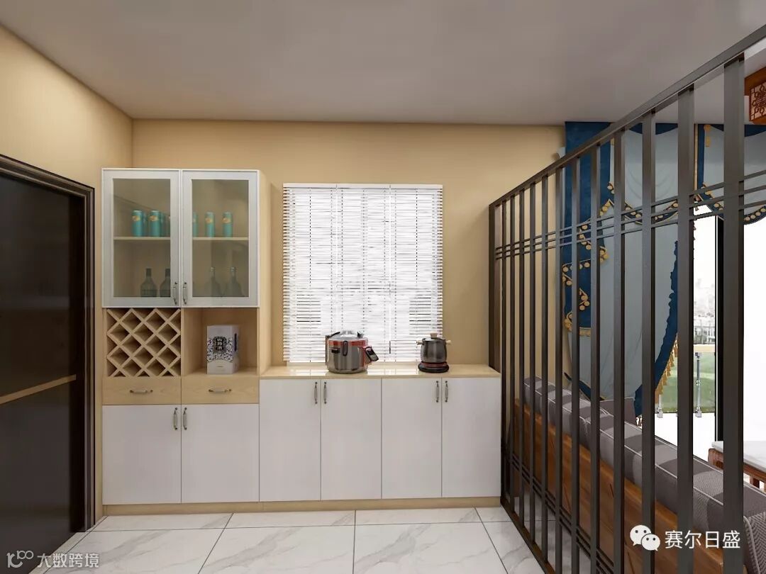 本案中,客厅、餐厅、厨房在同一条直线上,中间过道一侧临墙,墙的右侧有窗,刚好可以做成一个L型酒柜,有效利用墙体空间,四周柜体做足收纳,中部满足装饰、摆设作用。