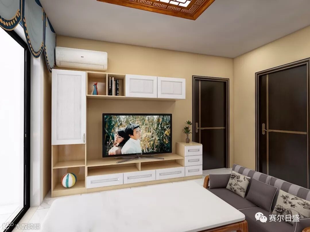 本案就是采用“山”字的组合电视柜,既有精致的造型,又有实用的收纳展示功能。