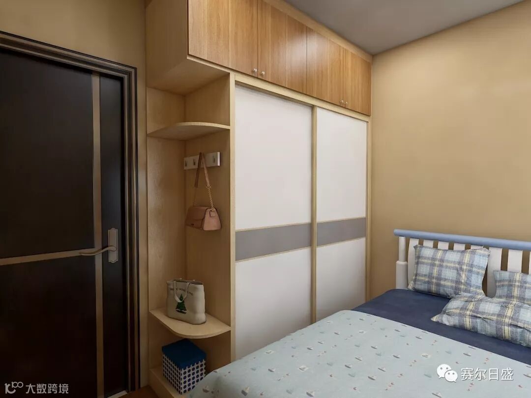掩门衣柜收纳衣服,中间半开放设计,多个收纳格的储物格将柜体内部做了细分,可放置鞋子、包包等。一边的侧面,将衣柜的功能延展,设计成展示柜,可以放置书、包包或者其他装饰用品。
